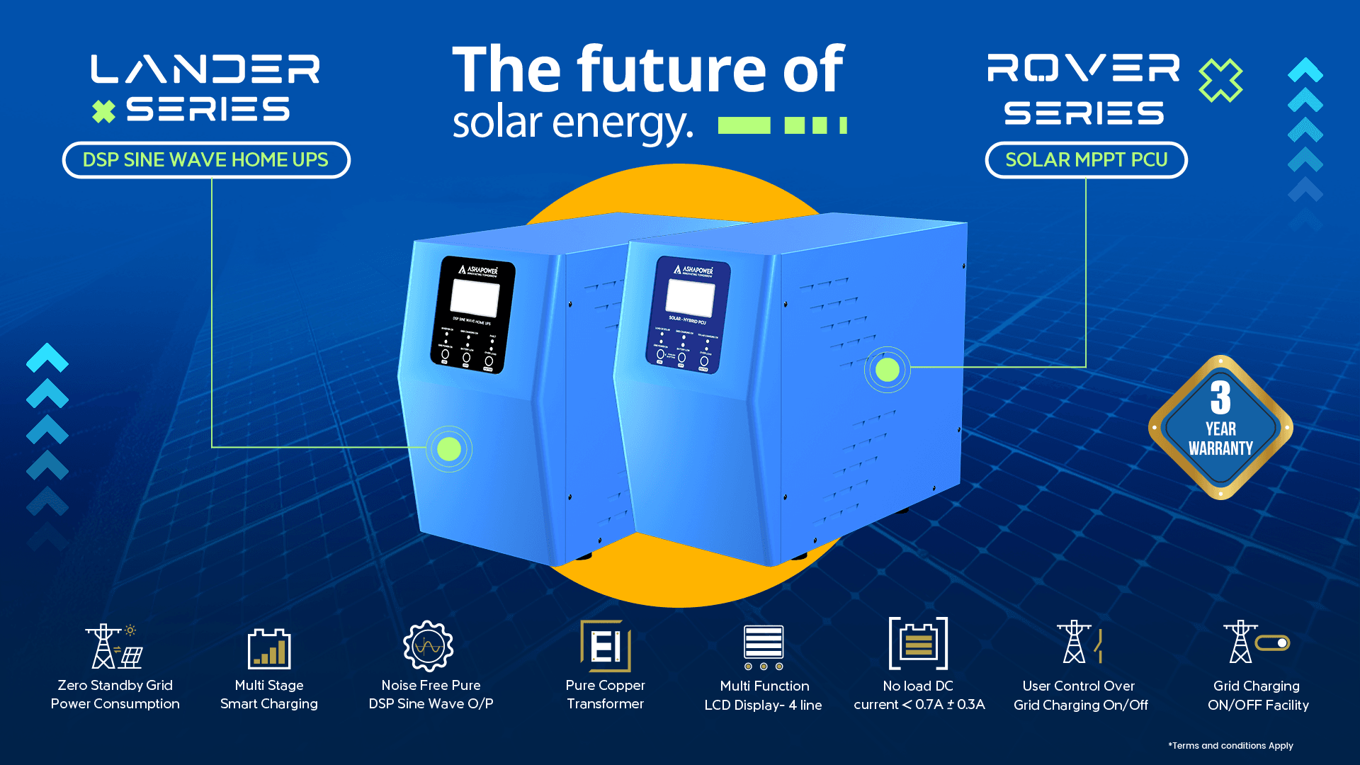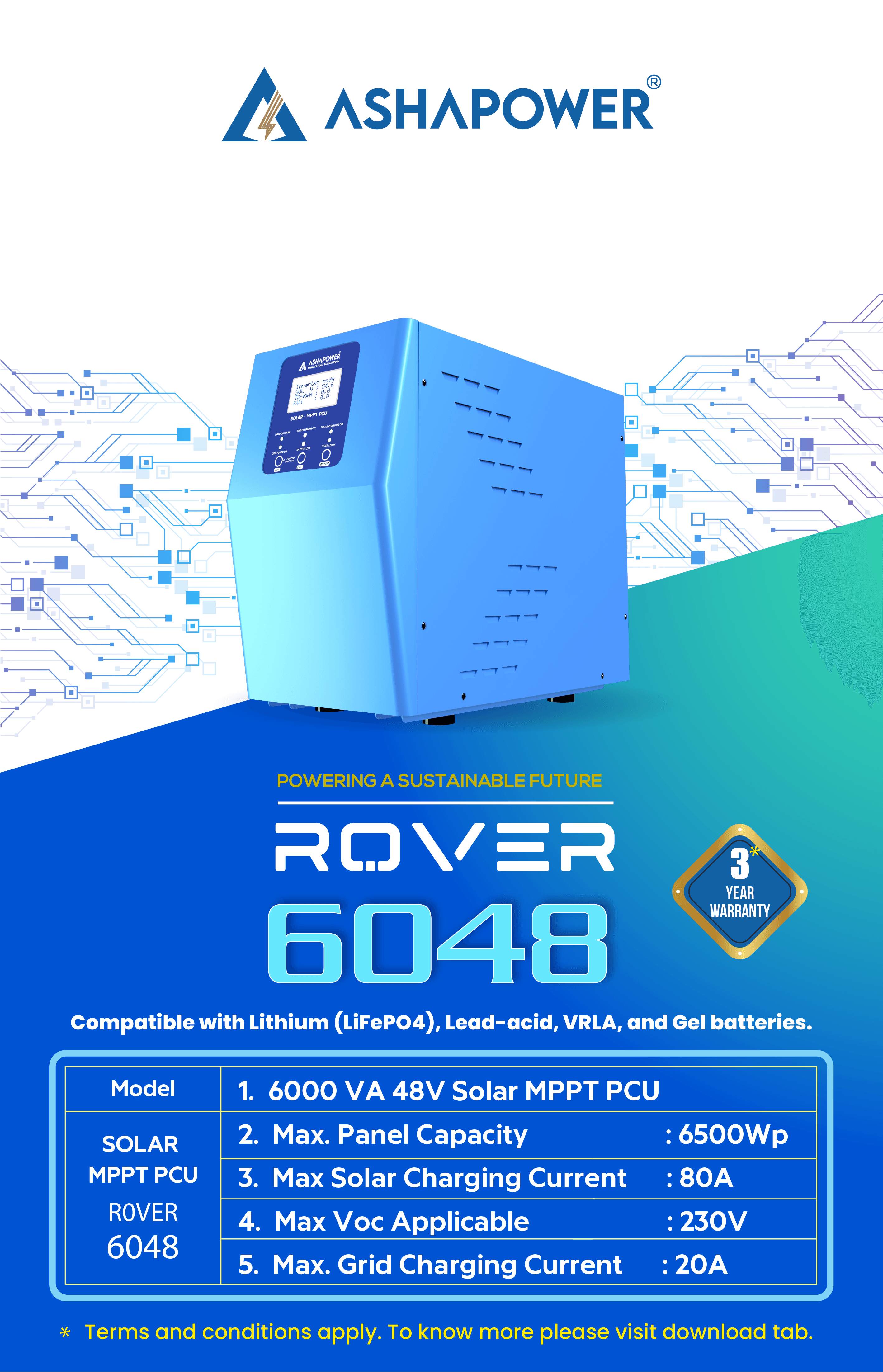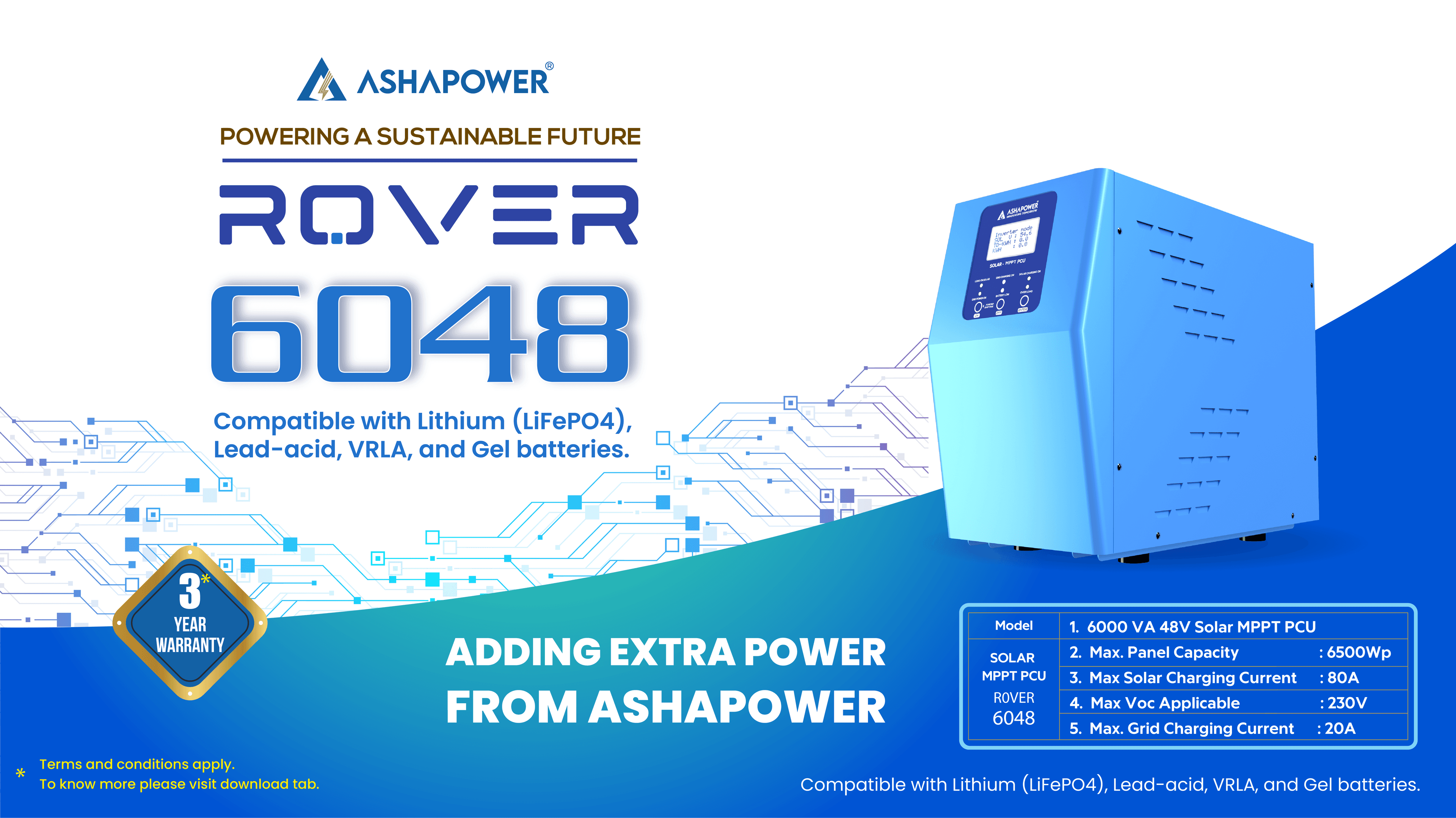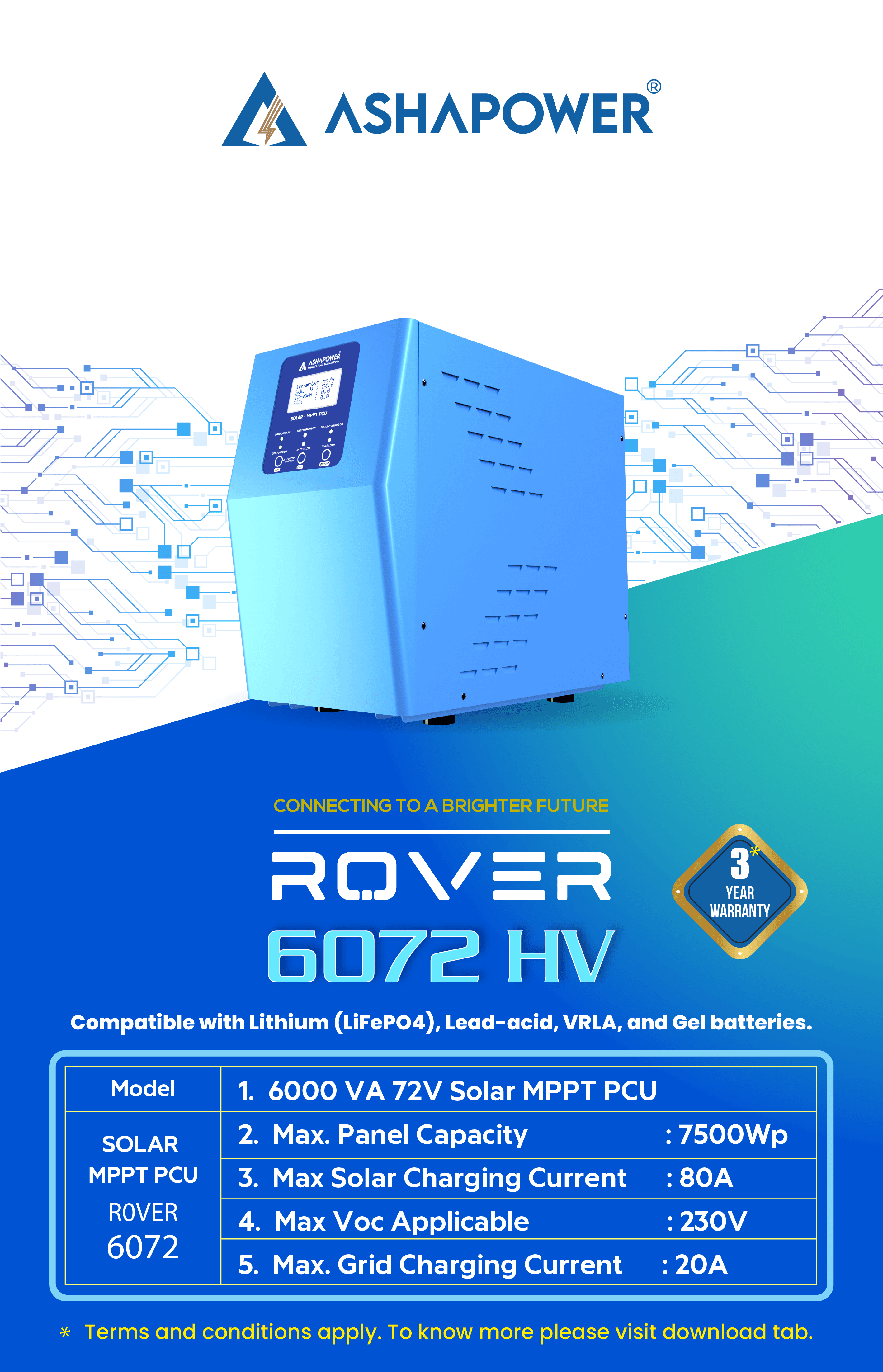 ASHAPOWER Introduces the ROVER Series: A Major Breakthrough in Solar MPPT PCU Solutions. Leveraging 8+ years of expertise, our cutting-edge innovation offers unparalleled efficiency, reliability, and power quality. At its core, a solar inverter plays a vital role in solar energy systems, converting DC power from solar panels into AC power, enabling safe and efficient grid integration. The ROVER Series is a next-generation solar inverter designed to optimize energy harvesting, and has been comprehensively tested across diverse Indian environments to ensure seamless integration, uninterrupted power supply, and exceptional performance. Discover a new standard of solar energy excellence with the ROVER Series, engineered to exceed expectations.