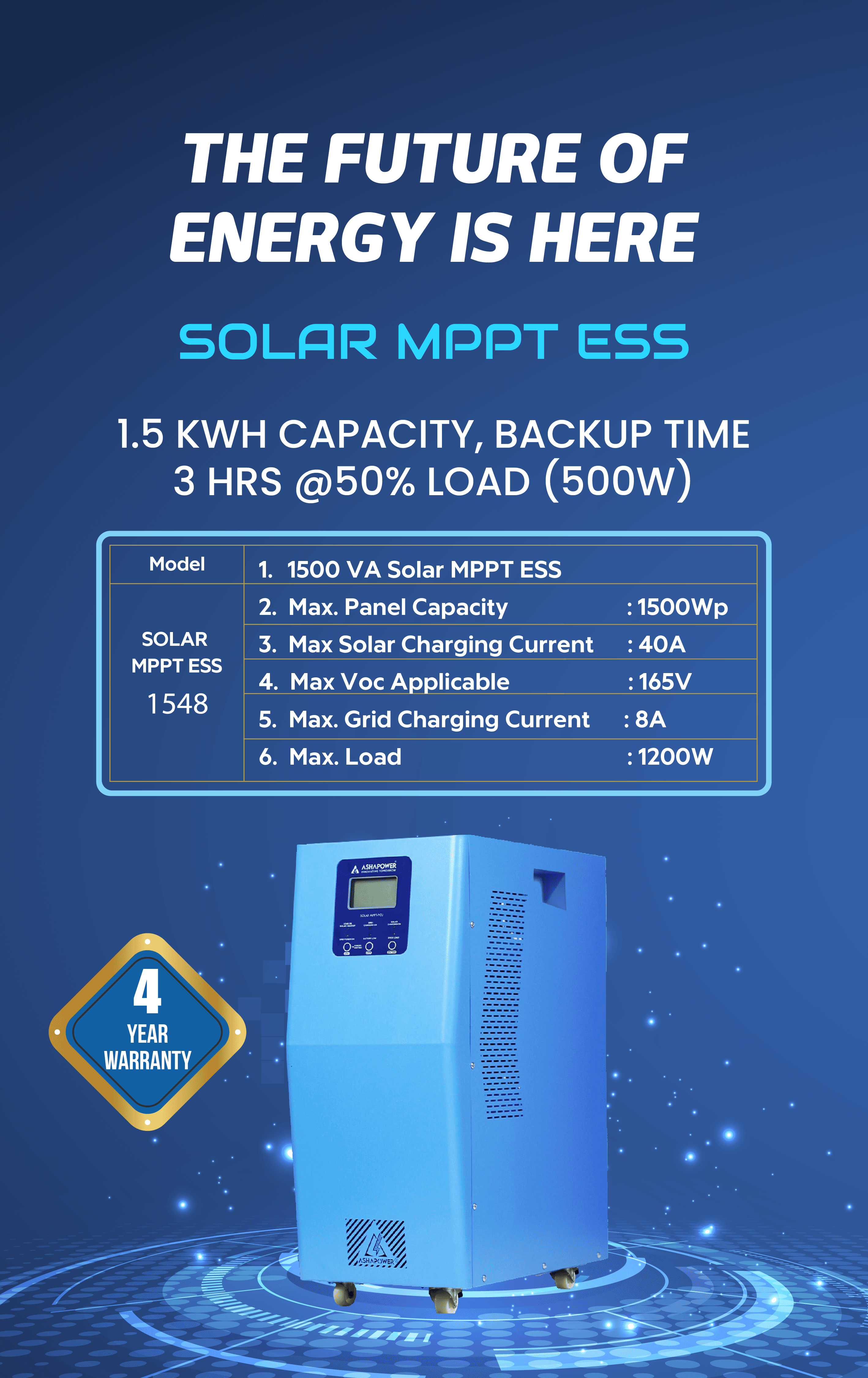 Ashapower is thrilled to introduce the ESS1548, a groundbreaking Solar Energy Storage System that seamlessly integrates solar power and advanced lithium Ferro Phosphate battery storage. The ESS1548 delivers exceptional efficiency, durability and safety, making it an ideal solution for both residential and commercial energy needs. This innovative solution unlocks a future of limitless possibility, providing energy independence, reliable backup power from its high-capacity lithium battery, and personalized energy management. With its compact design, robust performance, and eco-friendly attributes, the ESS1548 sets a new standard for sustainable energy solutions. Experience the future of energy today with the ESS1548, and enjoy adaptable power that meets your needs, whenever and wherever you need it.