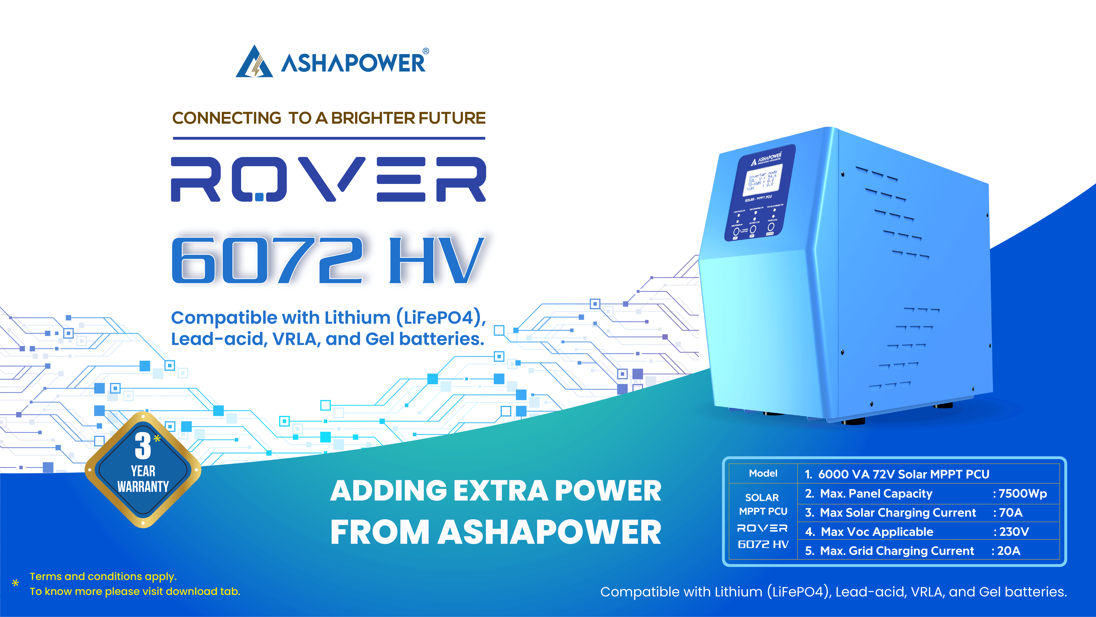 ASHAPOWER Introduces the ROVER Series: A Major Breakthrough in Solar MPPT PCU Solutions. Leveraging 8+ years of expertise, our cutting-edge innovation offers unparalleled efficiency, reliability, and power quality. At its core, a solar inverter plays a vital role in solar energy systems, converting DC power from solar panels into AC power, enabling safe and efficient grid integration. The ROVER Series is a next-generation solar inverter designed to optimize energy harvesting, and has been comprehensively tested across diverse Indian environments to ensure seamless integration, uninterrupted power supply, and exceptional performance. Discover a new standard of solar energy excellence with the ROVER Series, engineered to exceed expectations.
